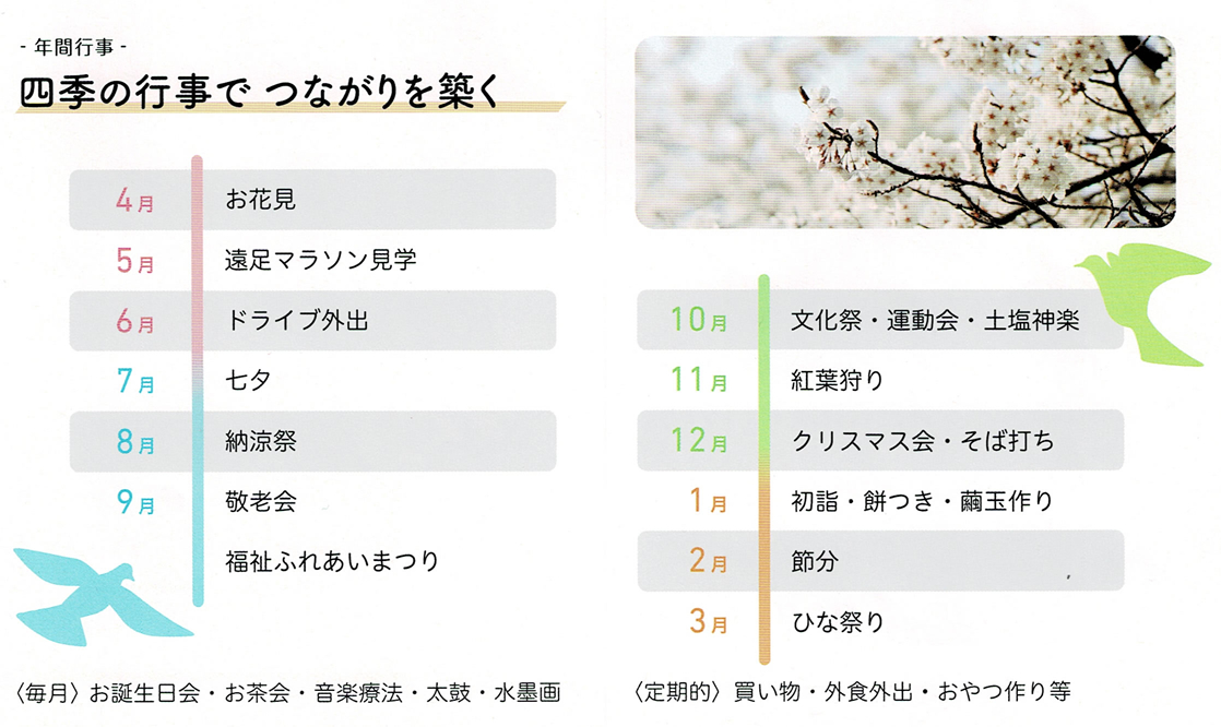 地域との交流、四季折々の行事を通してより深い心のつながりを築いていきます。 利用者同士で作る手作り料理。楽しむさまざまな行事。雰囲気はもちろん、行事に合わせた特別メニューを用意致しております。 そのすべてに、1年を通して満足していただけることと思います。 特別養護老人ホームうすいの里にて行っている活動をイベント開催のお知らせとして、 順次掲載いたします。 どうぞ、お楽しみに・・・